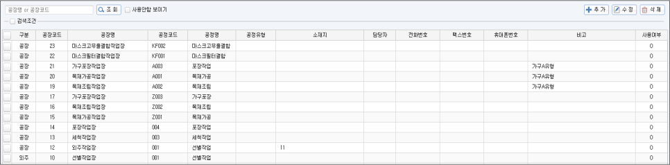 다공정 품목의 생산지시서 작성 시 생산품목에 입력되는 공장정보를 등록/관리하는 메뉴로, 공장정보에는 필수값으로 [공정등록] 메뉴에서 등록된 공정이 생산공정으로 지정되어야 합니다. 하나의 공장외주처는 하나의 생산공정만 가질 수 있으며, 동일 공장에서 다른 생산공정을 처리하여야 하는 경우에는 별도로 공장을 다시 등록해 주셔야 합니다. (* 이는 하나의 공정이 여러 공장에 입력될 수 있기 때문입니다.)