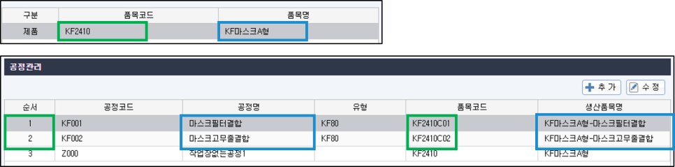 최종공정이 아닌 공정에서 생산되는 품목의 경우 최종 생산품목의 품목코드/품목명과 해당 공정의 공정순번과 공정명을 합쳐서 품목을 생성하여 [기초정보] - [품목]에 반제품 품목으로 등록합니다.