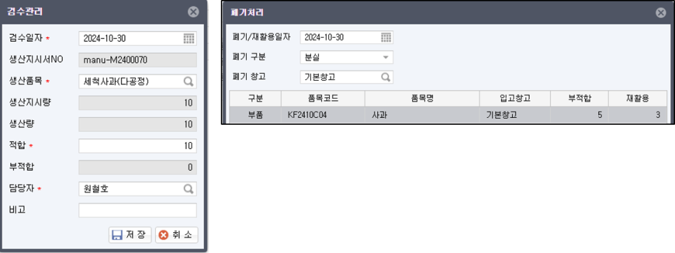 부적합 수량이 존재하는 검수관리 내역을 선택한 후 폐기처리 버튼을 클릭하면 폐기 처리를 진행할 수 있습니다. 해당 팝업에서 부적합으로 지정된 수량은 입출고에서 선택된 폐기 구분으로 분실/폐기 처리됩니다. 다만 폐기된 생산품목이 재활용이 가능한 경우, 재활용 수량을 입력하면 해당 생산품목의 소요부품이 다시 물류재고에 입고 처리 되게 됩니다. 이때 재활용 소요 부품은 일반 입고로 입력됩니다.