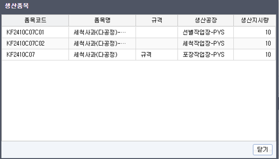 이와 같이 공정을 나누어서 관리하게 되며, 중간 공정의 결과물은 반제품 품목으로 관리합니다. 따라서 각 공정별로 작업 시간, 생산 실적, 검수 내역 관리를 할 수 있습니다.