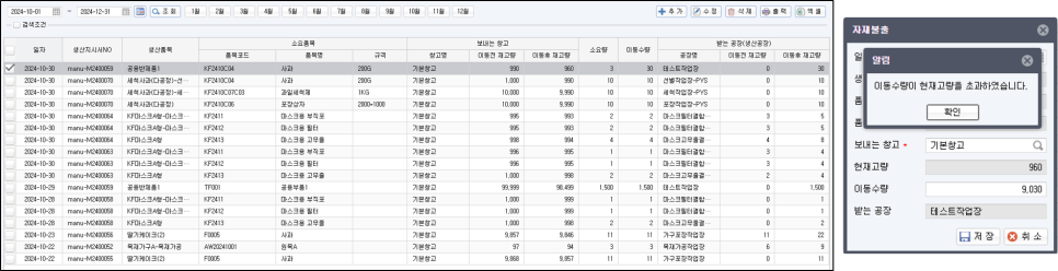 - 생산관리2(자재불출)의 경우 소요부품에 대한 출고처리를 하므로 재고수량에 대한 처리가 존재하는데, 재고수량이 부족한 경우에는 처리가 불가능하므로 자재불출에서 수량을 조정해주어야 합니다.