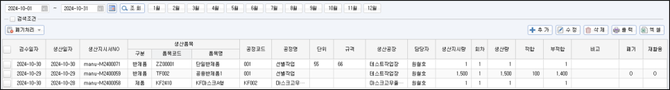 검수관리는 생산관리에서 생산처리하여 생산입고 된 생산품목의 불량률을 확인하고, 부적합 품목인 경우 폐기 또는 소요부품 재활용 처리하는 메뉴입니다.