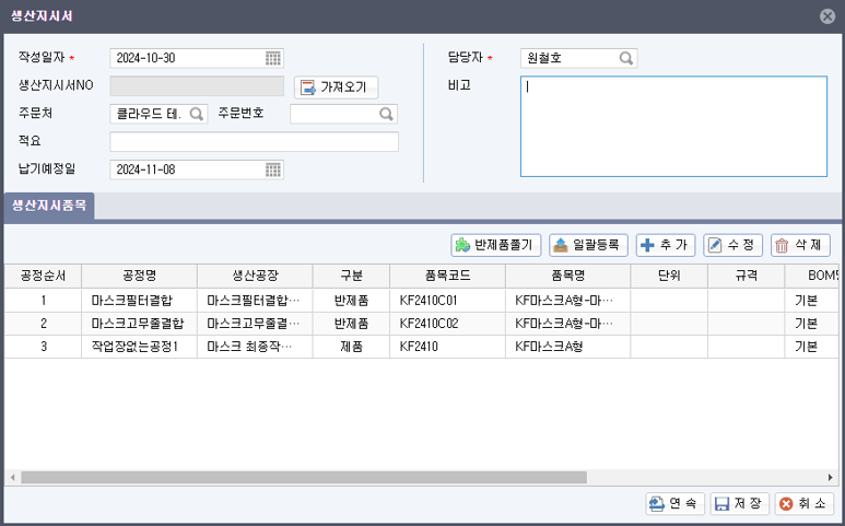5. [생산지시서] 메뉴 ▶ 생산지시서 작성