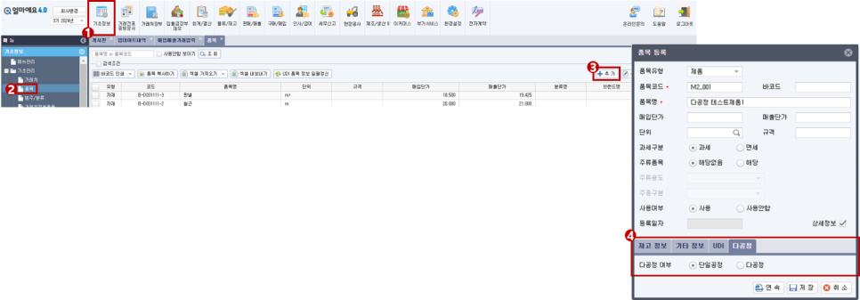 1. [기초정보]-[품목] 메뉴 ▶ 품목추가 시 다공정 옵션 선택