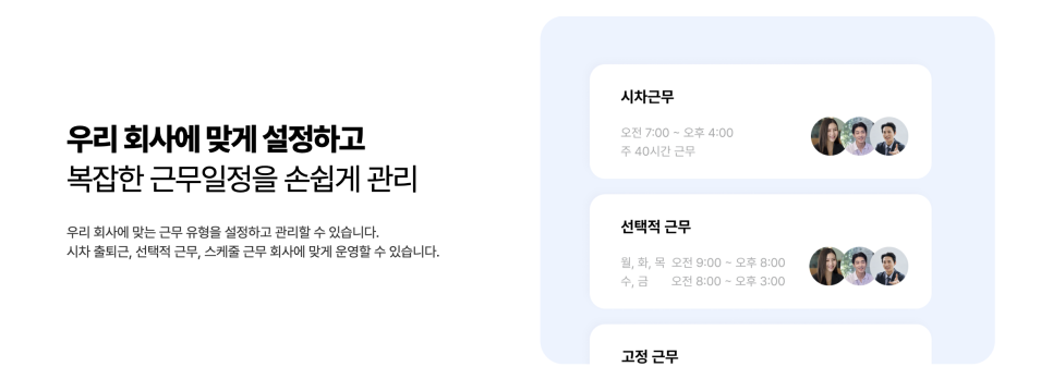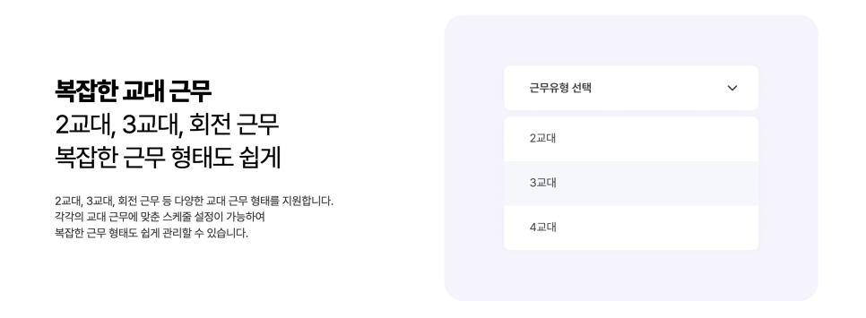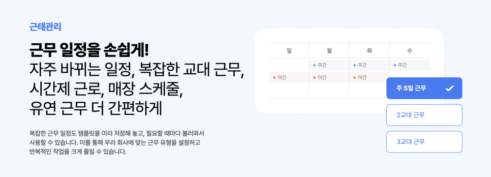 3조 2교대 근무, 3교대 근무와 같이 복잡한 교대 근무도 근무 템플릿으로 기록고 관리할 수 있고, 근무 패턴에 맞게 자유롭게 근무 일정을 수정할 수 있습니다.