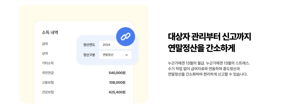 이를 바탕으로, 연말정산 업무를 진행하기 때문에 직접 수기로 작업하는 것보다 절차가 훨씬 간소화됩니다. 업무 파악 리소스는 줄고, 근무 시간은 단축되는 거죠.