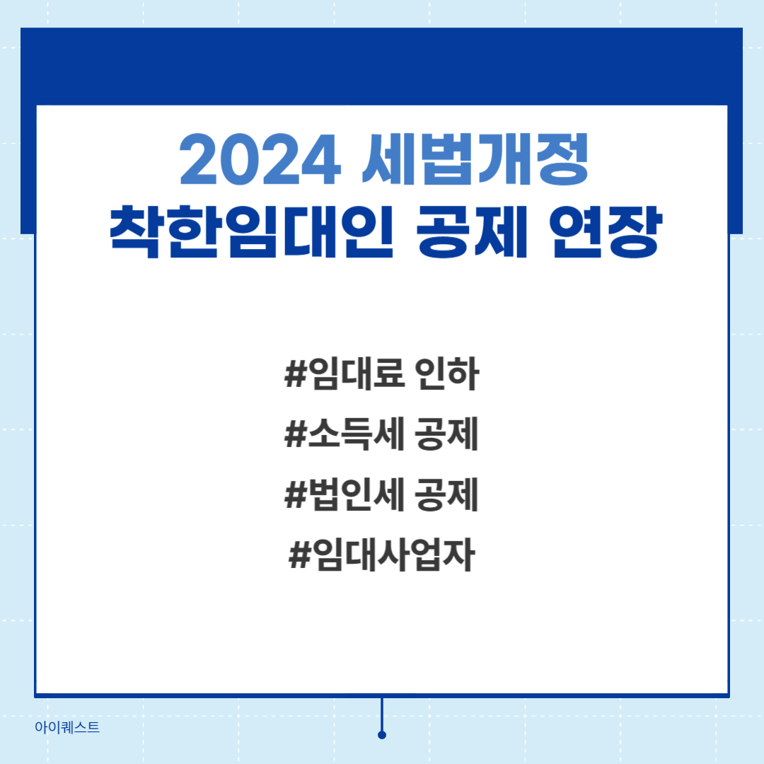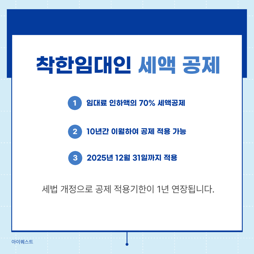 2024년 세법개정으로 착한임대인 세액공제 적용 기한이 1년 연장되었습니다. 착한임대인 세액공제란 소상공인의 상가임대료를 인하해준 임대사업자에게 임대료 인하액의 70%를 소득세 또는 법인세에서 공제하는 제도입니다. 세법이 개정되기 전에는 '24년까지 세액공제 적용이 가능하였지만, 소상공인의 임차료 부담 경감을 위하여 적용기한이 연장되며 2025년 12월 31일까지 세액공제를 적용받을 수 있게 되었습니다.