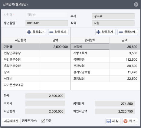 아이퀘스트 AI 경리회계 솔루션 [얼마경리]는 상여금과 과세표준에 맞춰서 소득세와 지방소득세를 자동으로 계산해 줍니다.