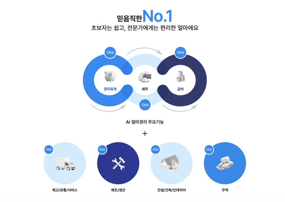 [얼마에요 ERP]에는 아이퀘스트의 인공지능 솔루션인 [AI 얼마경리] 기능이 적용되어, 유통, 제조, 건설, 무역 등 각 산업 분야에 맞게 경리회계, 세무, 급여 업무를 처리할 수 있습니다.