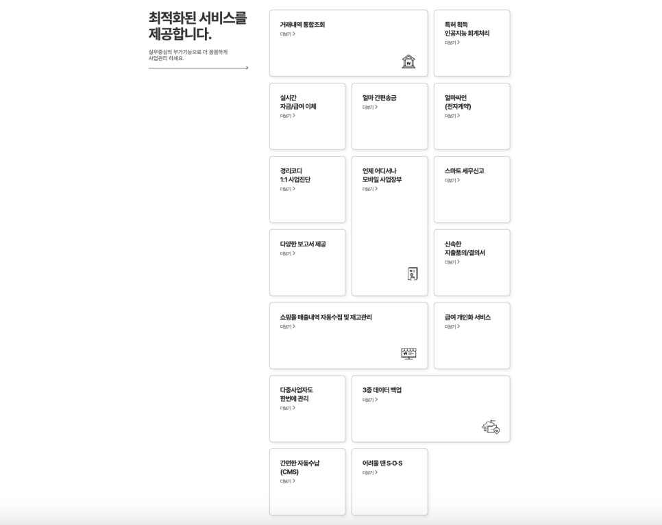 각 산업 분야에 특화된 클라우드 ERP를 사용할 수 있으며, 아이퀘스트만의 기술력으로 개발한 인공지능 경리회계 기능과 클라우드 시스템을 사용할 수 있습니다.