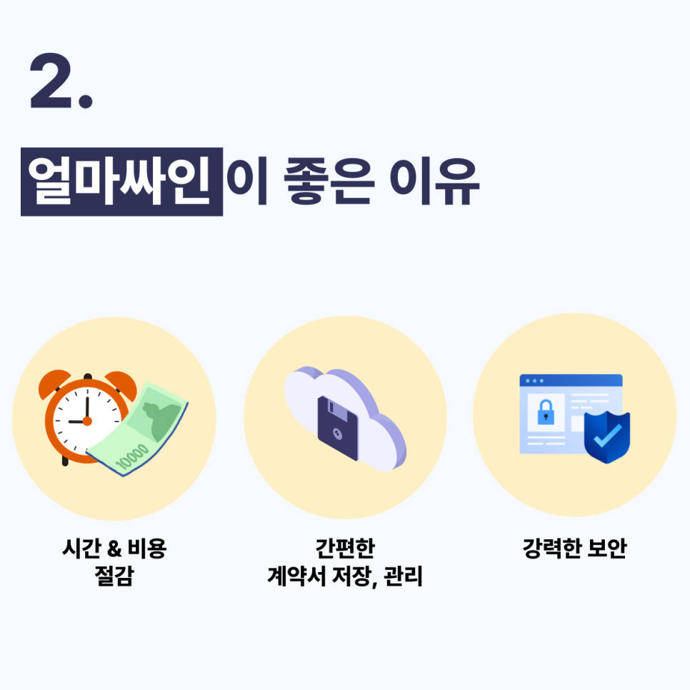 서면 계약에 비해 블록체인 기반의 간편하고 안전한 전자계약 서비스, 얼마싸인은 계약서 작성, 서명, 보관 등에 소요되는 시간이 대폭 줄어듭니다. 또한, 물리적인 종이문서 없이 전자로 관리할 수 있어 인쇄, 우편 발송 등의 추가 비용도 절감됩니다.