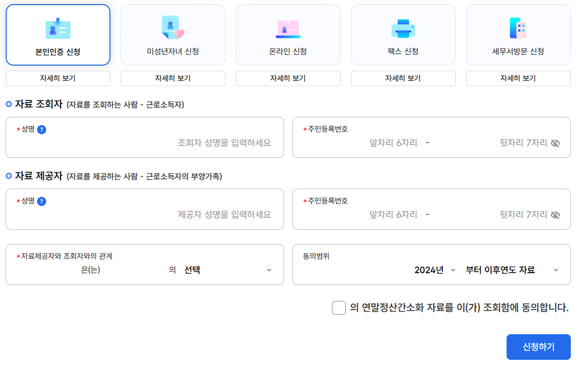 연말정산 대상자가 부양가족의 간소화 자료를 조회하기 위해서는 부양가족의 자료 제공 동의가 필요합니다. 자료제공자는 홈택스를 통하여 본인인증을 하고, 자료제공 동의를 위해 다음과 같은 정보를 입력 후 동의 신청 절차를 진행하여야 합니다. 만약 부양가족(자료제공자)이 만 19세 미만 자녀인 경우에는 '미성년자녀 자료 제공 동의 신청'을 통하여, 연말정산 대상자인 부모가 직접 인증 및 자료제공 동의를 신청하게 됩니다.