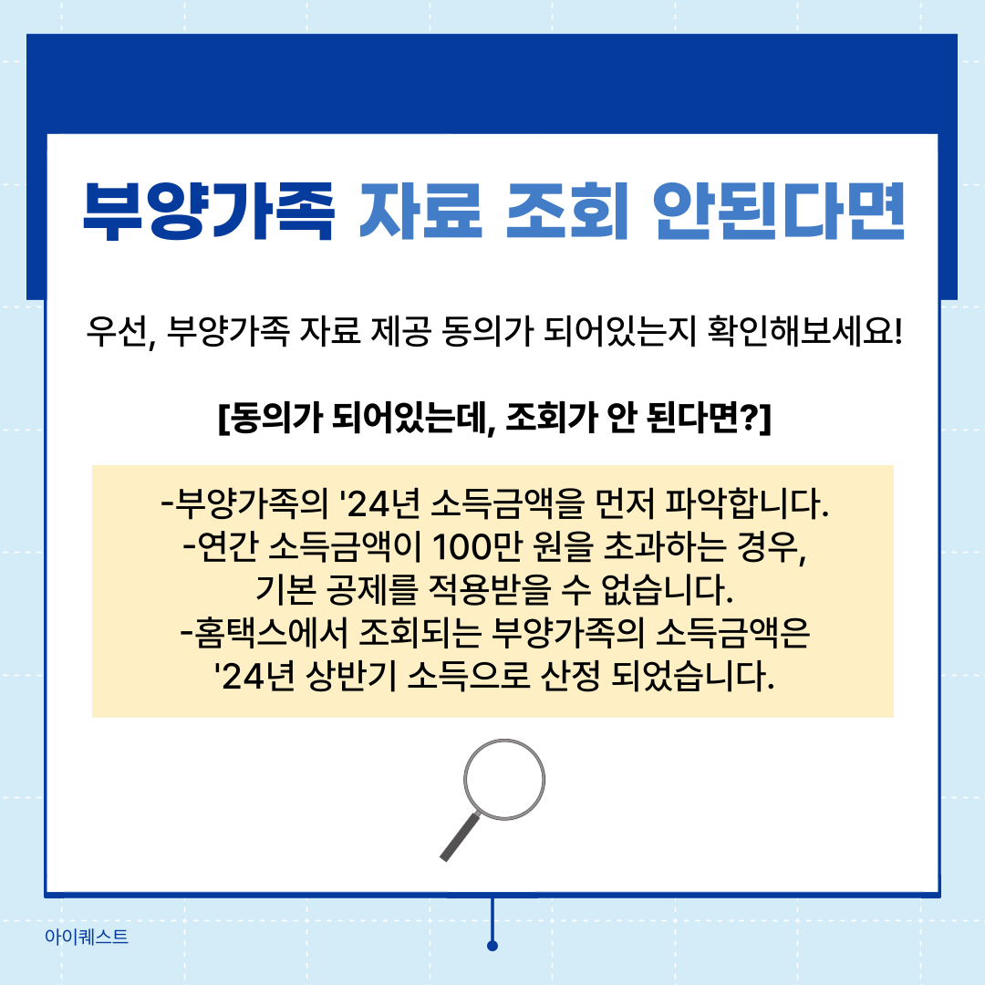 따라서 부양가족의 간소화 자료가 조회되지 않는 경우에는 부양가족의 소득금액을 먼저 파악해보셔야 합니다. 만약 부양가족의 연간 소득금액이 100만원을 초과한다면, 해당 부양가족에 대한 기본공제를 적용받을 수 없습니다. 다만 국세청이 파악한 소득은 '24년 상반기의 ①근로 ②사업 ③기타소득, ④양도소득, ⑤퇴직소득이며, 이를 토대로 소득금액을 산정했기에 정확한 소득은 '24년 전체 기간으로 파악하셔야 합니다. 또한 부양가족의 간소화 자료가 조회되더라도 하반기에 추가로 소득이 발생하는 경우에는 소득기준을 초과할 수 있으므로, 부양가족의 연간 소득 지급내역 등을 정확하게 확인하여 공제를 적용받을 수 있도록 유의하시기 바랍니다.