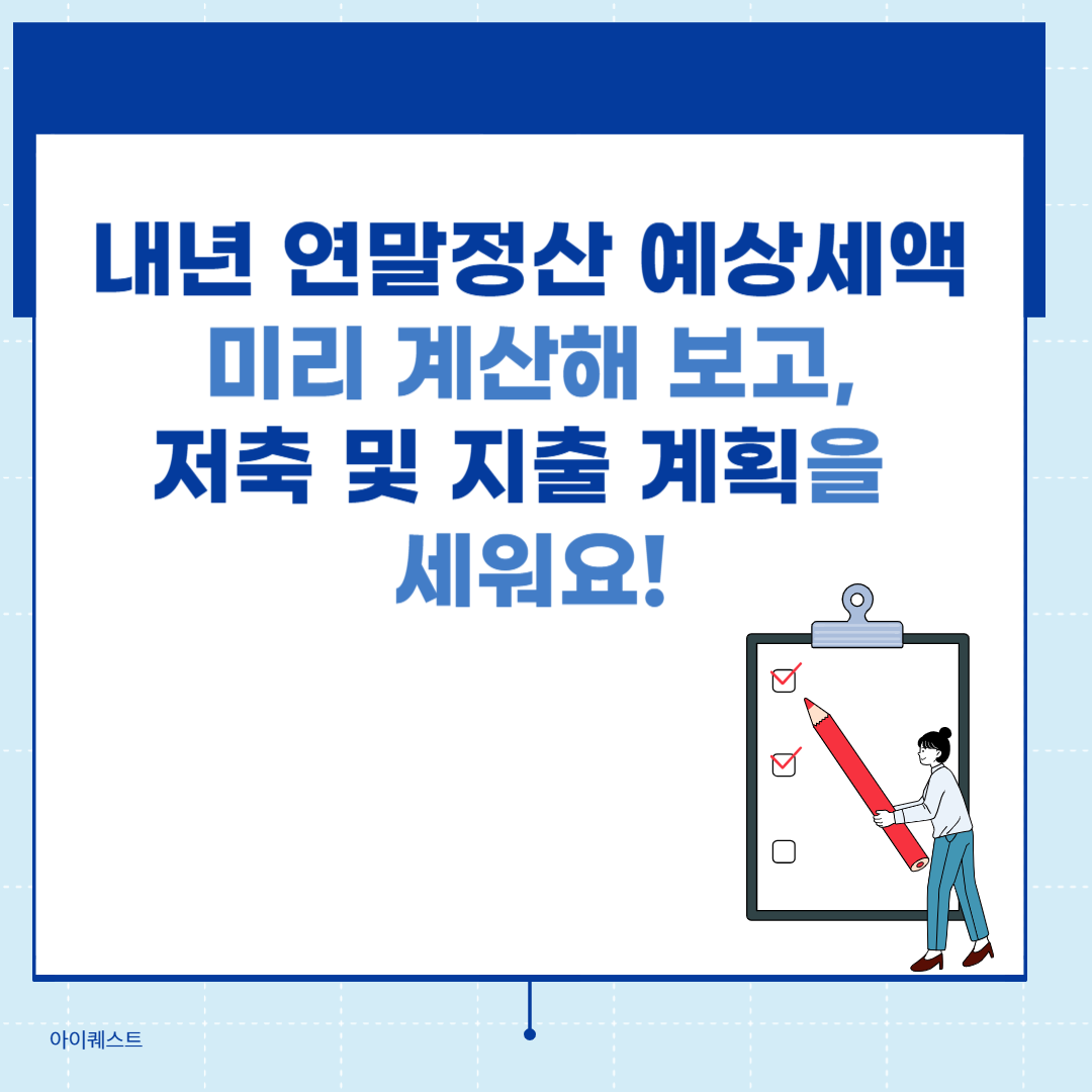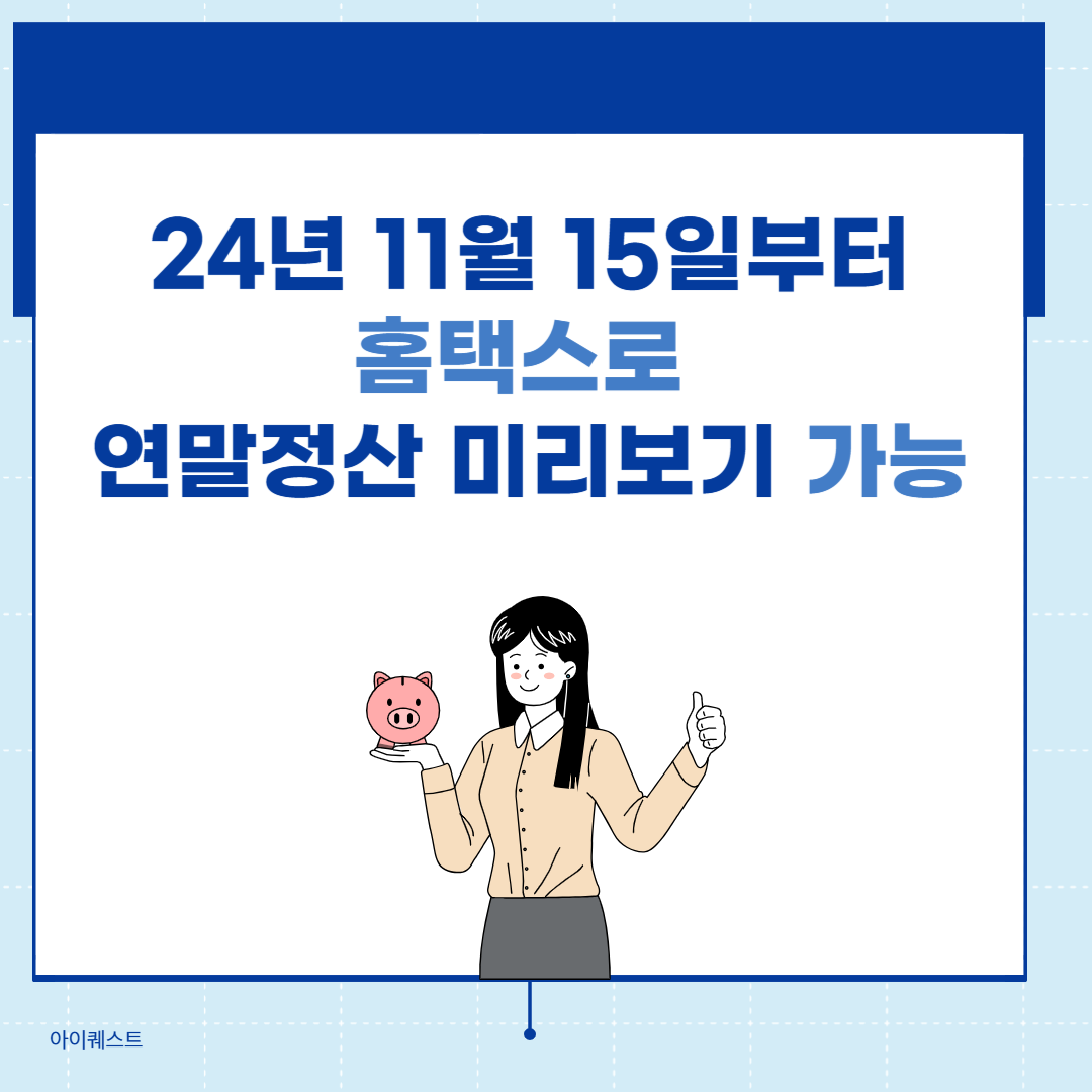 국세청은 납세자가 연말정산 세액을 미리 계산해보고, 절세를 위한 준비를 할 수 있도록 연말정산 미리보기 서비스를 오픈하였습니다. 연말정산 미리보기 서비스를 이용하시면 근로자의 지난 해 연말정산 내용과 국세청이 수집한 2024년 1~ 9월의 신용카드 사용금액을 확인할 수 있으며, 이를 바탕으로 연말정산 예상 세액을 계산 해 볼 수 있습니다.