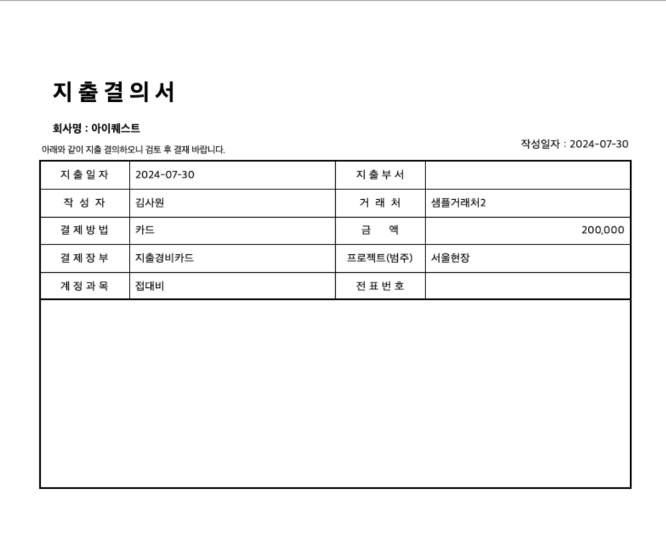 결의서 작성이 완료되면 인쇄를 하고, 여기에 증빙자료를 첨부해서 결재를 받으면 됩니다. 또는 [얼마전자결재] 기능을 이용하여 증빙자료를 이미지로 첨부한 후 전자결재를 요청할 수 있어요.