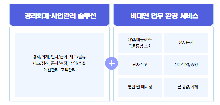 - 경리/회계, 인사/급여, 재고/물류, 제조/생산, 공사/현장, 수입/수출관리