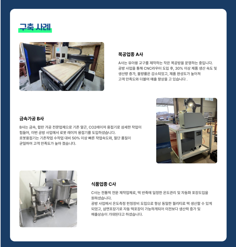 위 링크를 클릭하시면 2025년 스마트제조 지원강화사업 관련해 더 자세한 정보를 확인하실 수 있습니다.