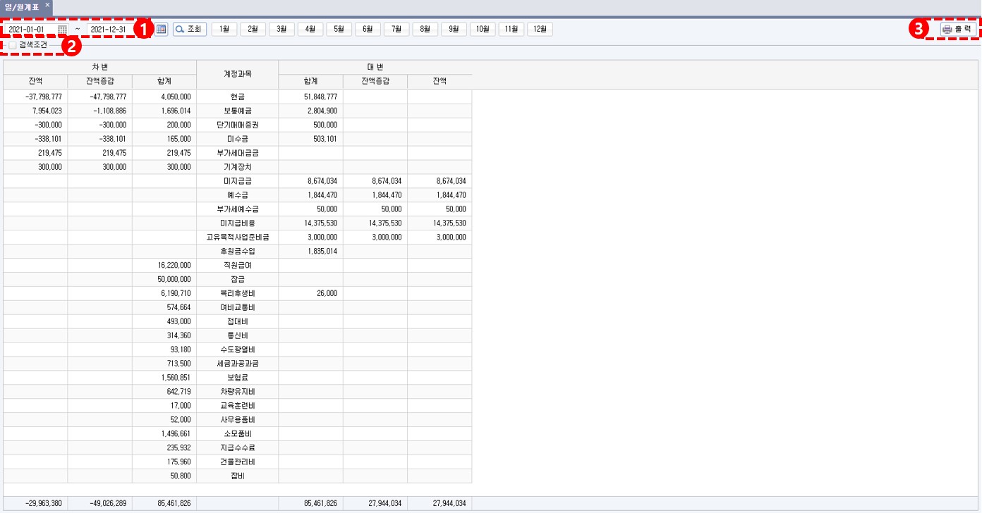 - 예출납장 출력과 월별 보고 업무 자동화 하는 방법 : [회계/결산] > [보고서] > [일/월계표]에서 하루 또는 기간 별로 발생한 모든 거래를 차/대변으로 나누어 합계잔액시산표 형태로 조회할 수 있습니다.