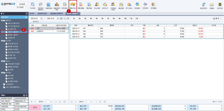 2. [물류관리] 카테고리 하단에 [거래처 수불내역]을 클릭하면 기간별 매입/매출 거래처, 매입/매출 날짜, 품목, 출고 여부 등을 한눈에 확인할 수 있습니다.