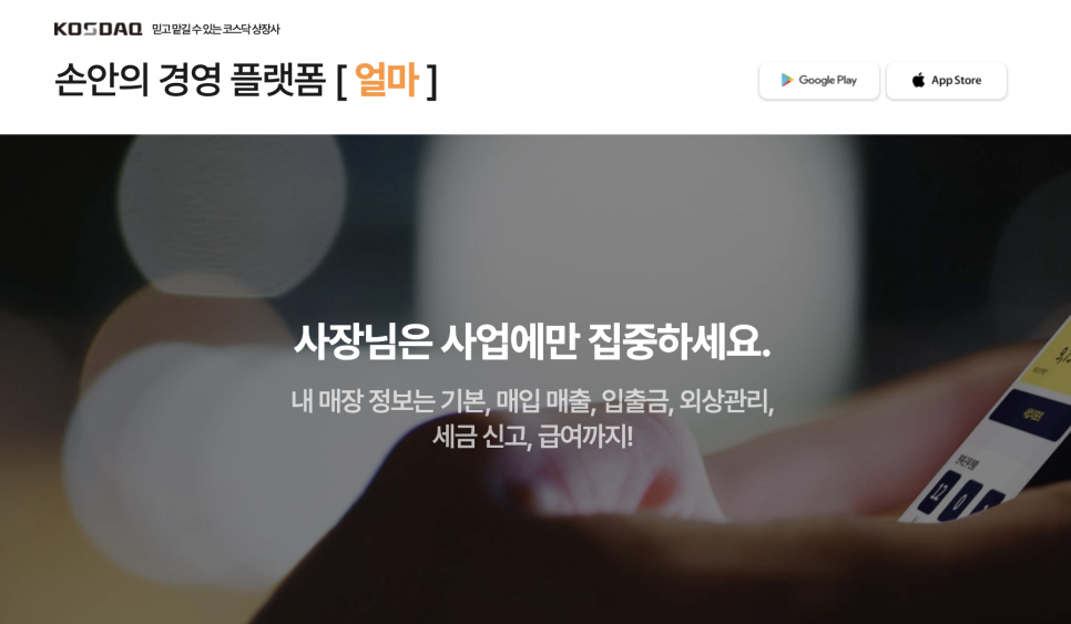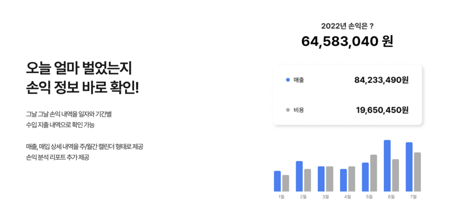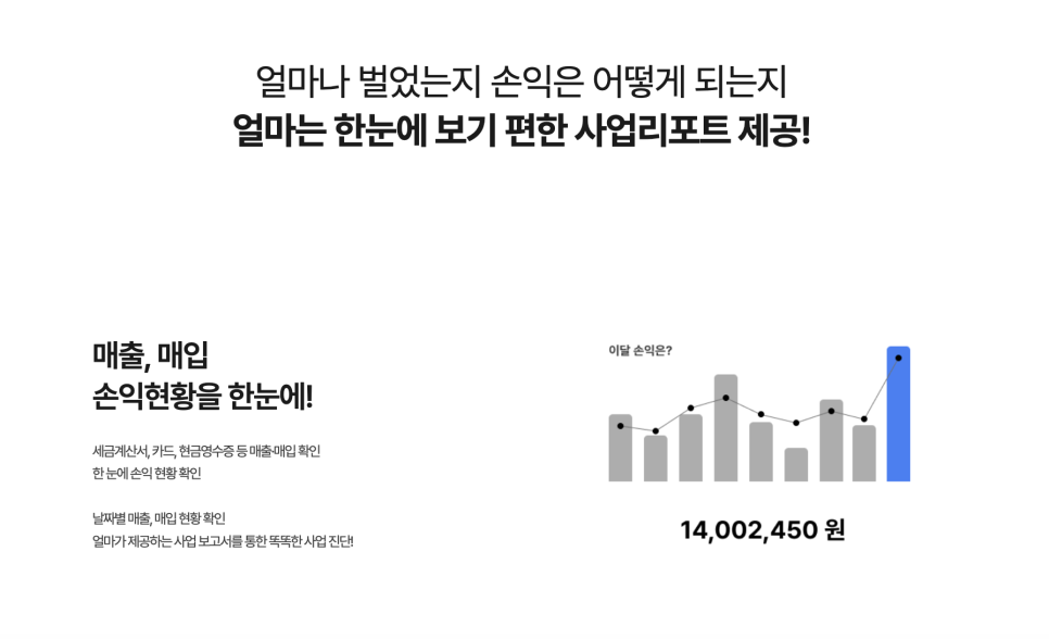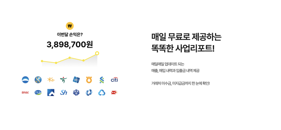 매출매입과 손익 현황 자동 기록 및 간편장부 기장, 일간 사업 리포트 작성, 통합계좌관리, 세금 신고 등 다양한 기능으로 사업장 데이터를 관리할 수 있어 사업주분들은 경영에만 집중할 수 있습니다.