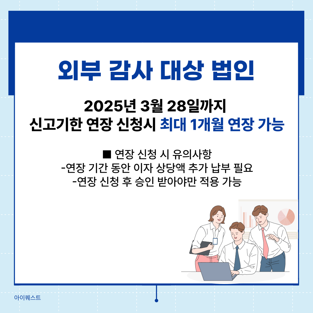 ✔️ 외부감사 대상 법인은 미리 세무 대리인과 상담하여 기한 연장 여부를 검토하는 것이 좋습니다.