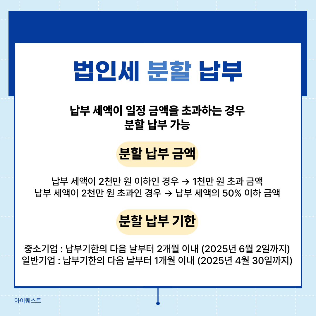 법인세 납부는 신고와 함께 진행되어야 하지만, 납부세액이 일정 금액을 초과하는 경우 분할납부가 가능합니다.