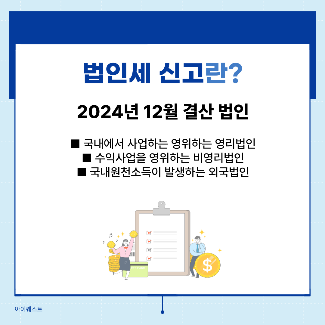 법인세는 법인의 소득에 부과되는 세금으로, 일정 요건을 충족하는 모든 법인이 신고 대상에 포함됩니다. 2024년 12월 결산 법인이라면 법인세 신고 대상이며, 다음과 같은 법인이 포함됩니다.