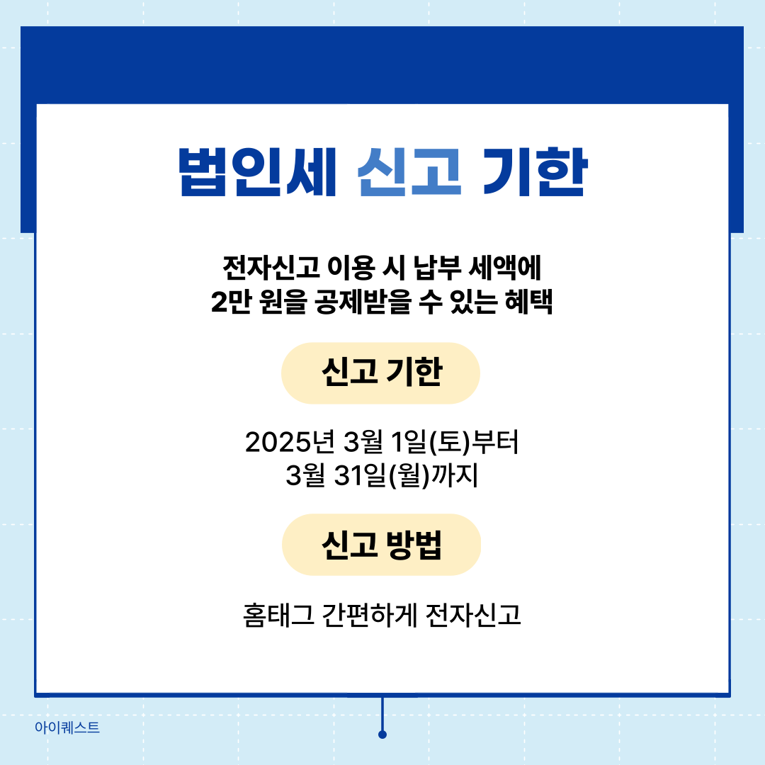 법인세 신고 기한은 2025년 3월 1일(토)부터 3월 31일(월)까지입니다. 3월 31일까지 반드시 신고를 마쳐야 하며, 신고 기한을 넘길 경우 가산세 등의 불이익이 발생할 수 있으므로 유의해야 합니다.