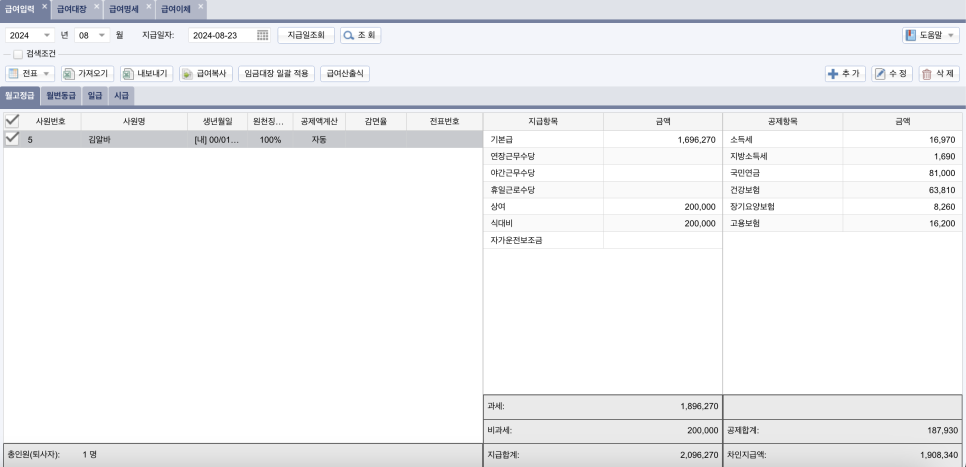공제 항목을 새롭게 추가하거나 변경할 수 있고, 수당 항목별로 4대보험 계산 여부, 비과세 여부, 통상임금 포함 등을 설정하여 정확하게 급여를 지급할 수 있어요.