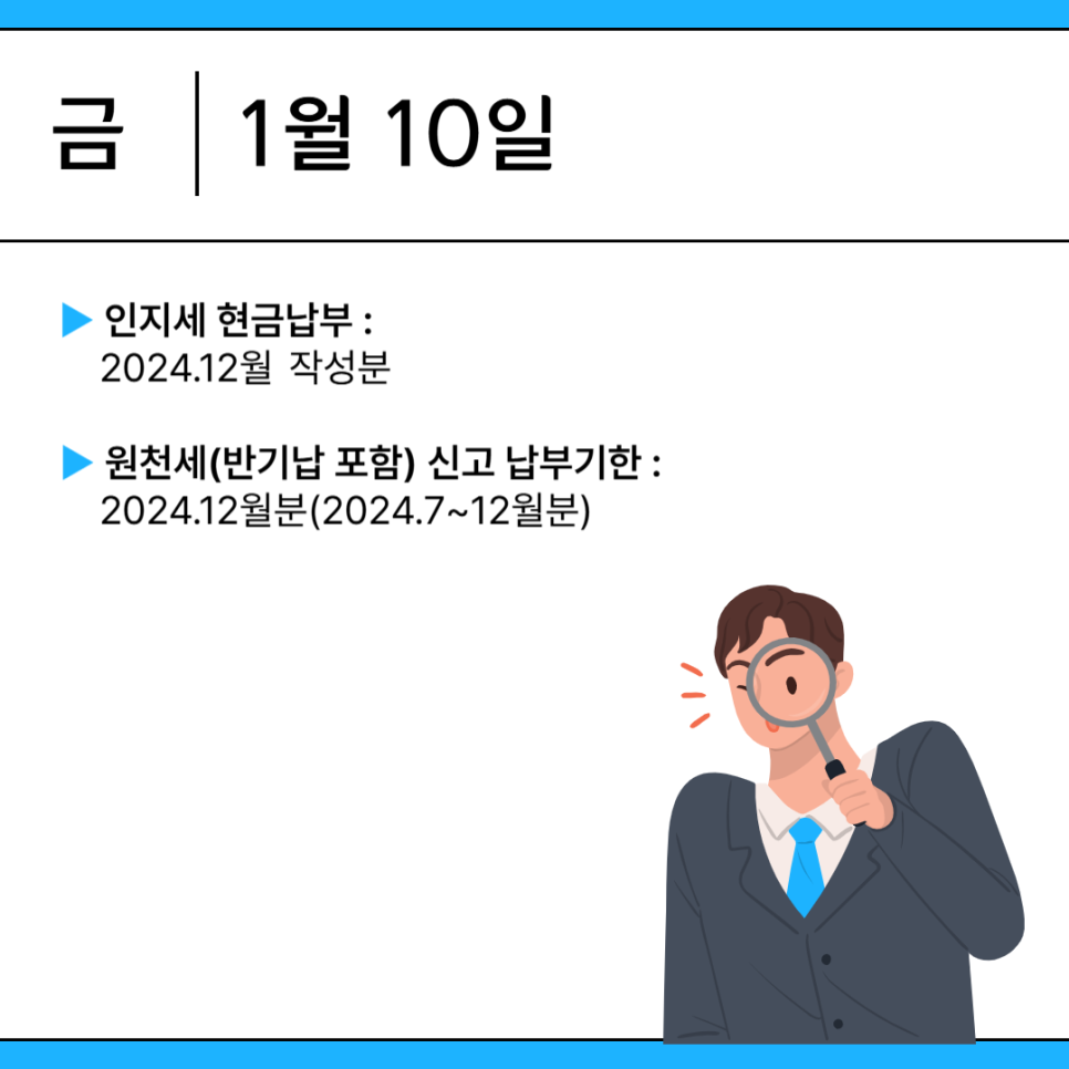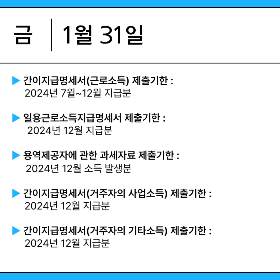 오늘은 2025년 1월 주요 세무일정에 대한 내용을 정리해 안내드리고자 합니다.