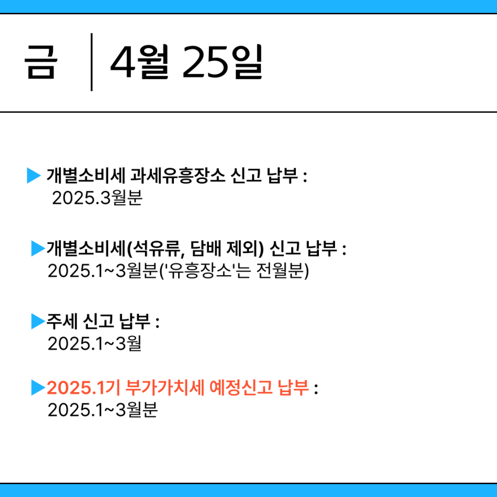 ※ 2025년 제1기 부가가치세 예정신고 및 납부는 4월 25일까지 입니다. 신고 대상자는 '25년 1~3월분 부가세를 법정 기한까지 신고 및 납부할 수 있도록 유의하시기 바랍니다.