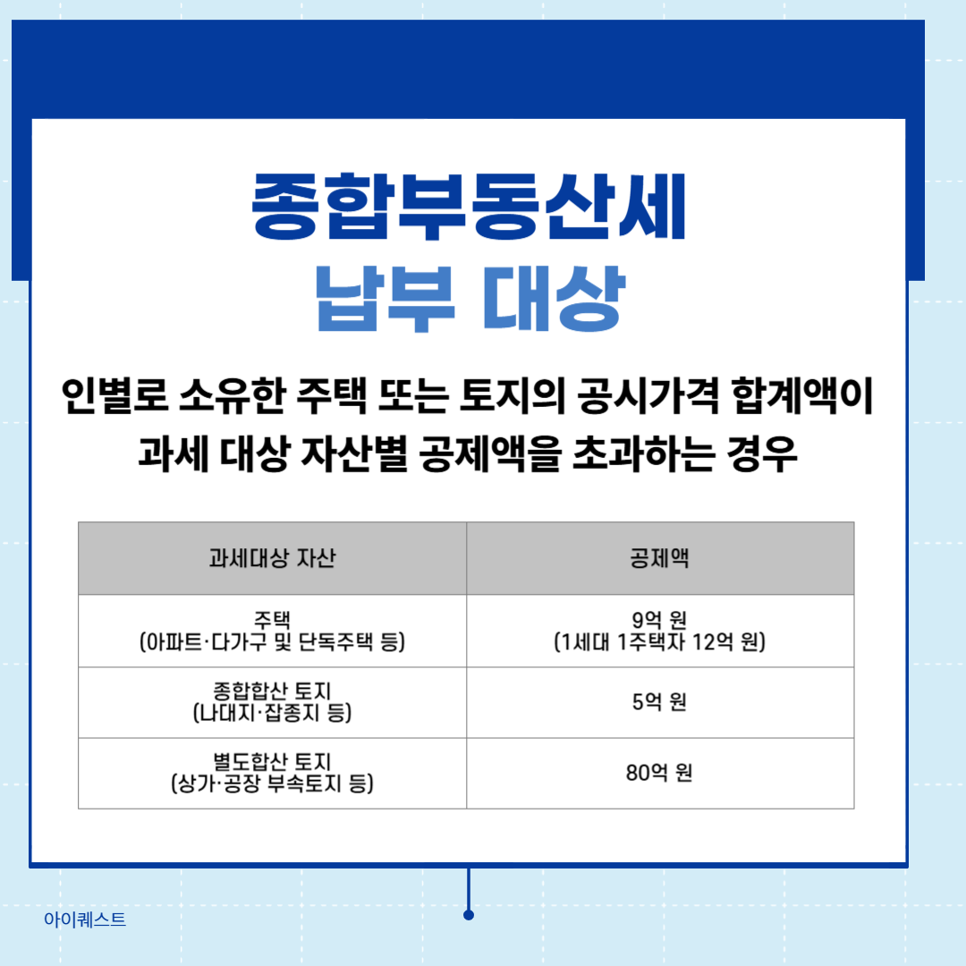 종합부동산세는 인별로 소유한 주택 또는 토지의 공시가격 합계액이 과세 대상 자산별 공제액을 초과하는 경우에만 부과됩니다. 과세대상 자산은 주택과 토지로 구분할 수 있으며, 자산별 공제액은 다음과 같습니다.