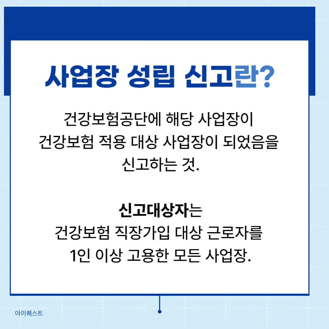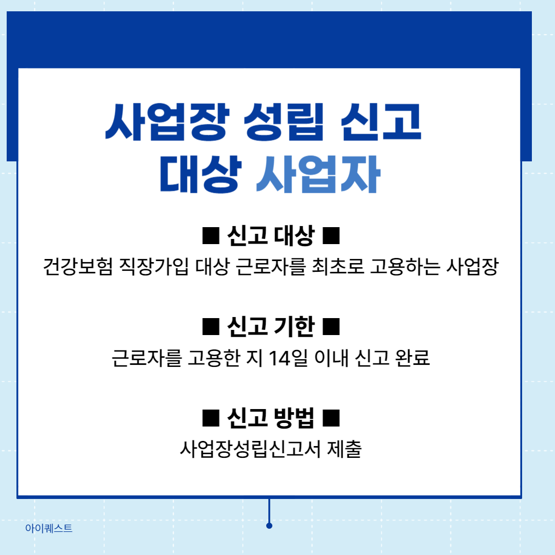 건강보험 직장가입 대상 근로자를 최초로 고용하는 사업장은 사업장 성립신고 대상자입니다. 건강보험 직장가입 대상 근로자를 고용한 사업장은 14일 이내에 사업장 성립 신고를 진행하여야 하며, 해당 근로자를 직장가입자 유형으로 건강보험 및 국민연금에 가입해 주어야 합니다.