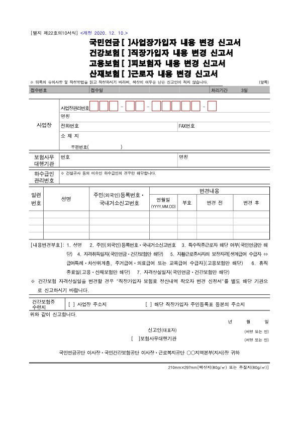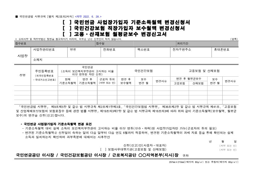 오프라인 신고는 ‘사업장 가입자 내용 변경 신고서’와 ‘국민연금 사업장 가입자 내용 변경 (정정)신고서’를 작성하고, 사업장 소재지 국민연금과 건강보험공단 관할 지사에 우편이나 팩스를 보내거나 직접 방문해서 제출하면 됩니다.