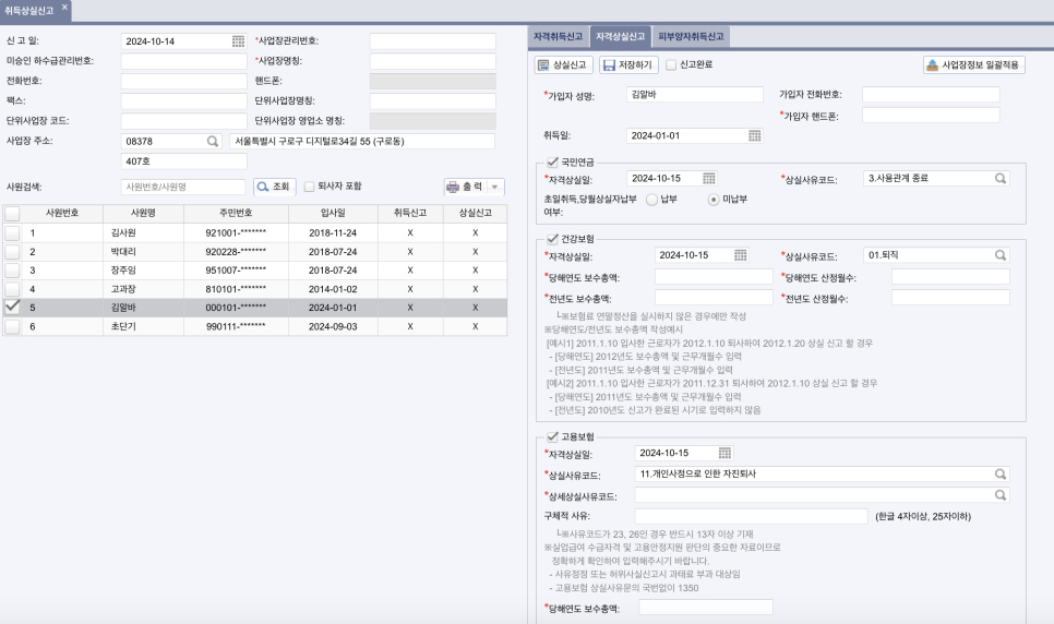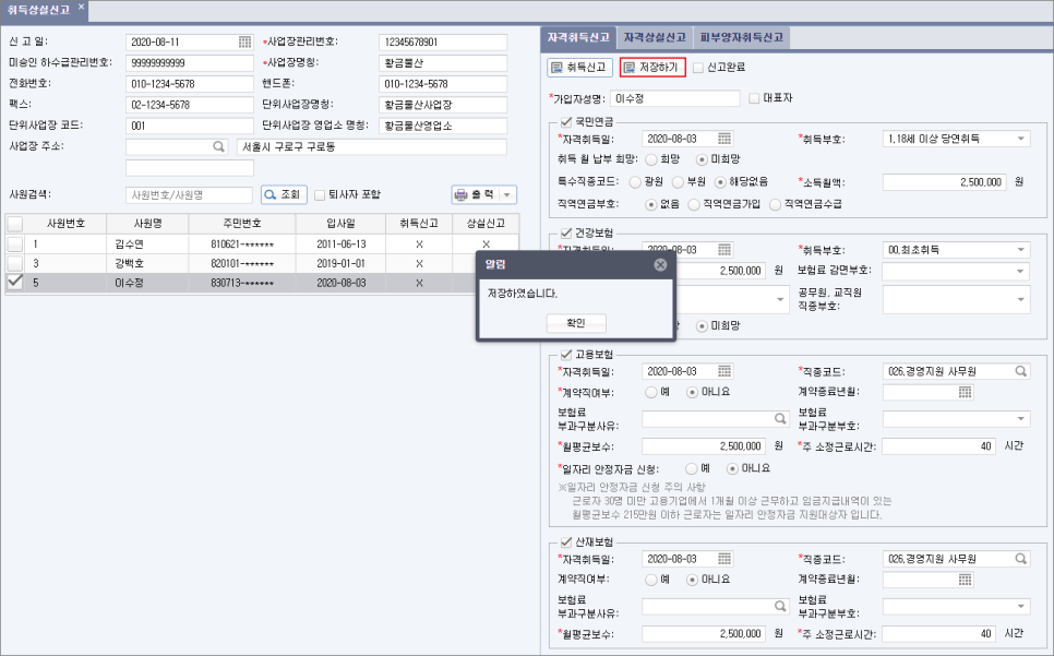 사원대장에 등록된 임직원 정보를 조회한 후 자격취득일자와 보수월액, 주 소정근로시간 등을 차례차례 입력하면 됩니다.