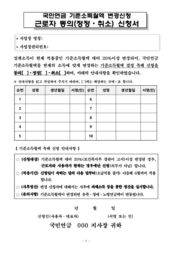 단, 국민연금은 매년 7월 전년도 소득을 기준으로 기준소득월액을 결정하므로 따로 변경된 보수를 신고하지 않아도 됩니다. 만약 급여가 20% 이상 변동이 있을 경우에는 근로자의 동의를 받고 관할 지사에 보수월액 변경을 신고할 수 있어요.