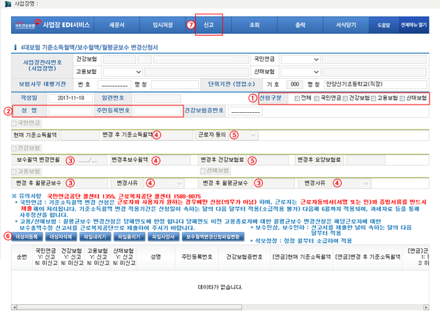 [국민건강보험 EDI]에서는 사업자 로그인 후 [신고/신청] → [4대보험 공통신고] → [가입자] → [4대보험 보수(소득)월액변경신청서] 순으로 접속하여 변경할 수 있어요.