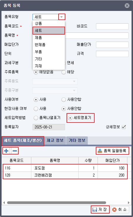 [세트품목(제조/생산)]의 구성품목을 [+/-] 버튼으로 추가수정하거나, 품목일괄등록으로 추가할 수 있습니다.