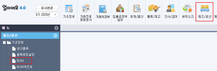 ② [기초정보] - [품목] - [세트품목(제조/생산)]에 등록된 품목은 [제조/생산] - [BOM]에 등록됩니다.