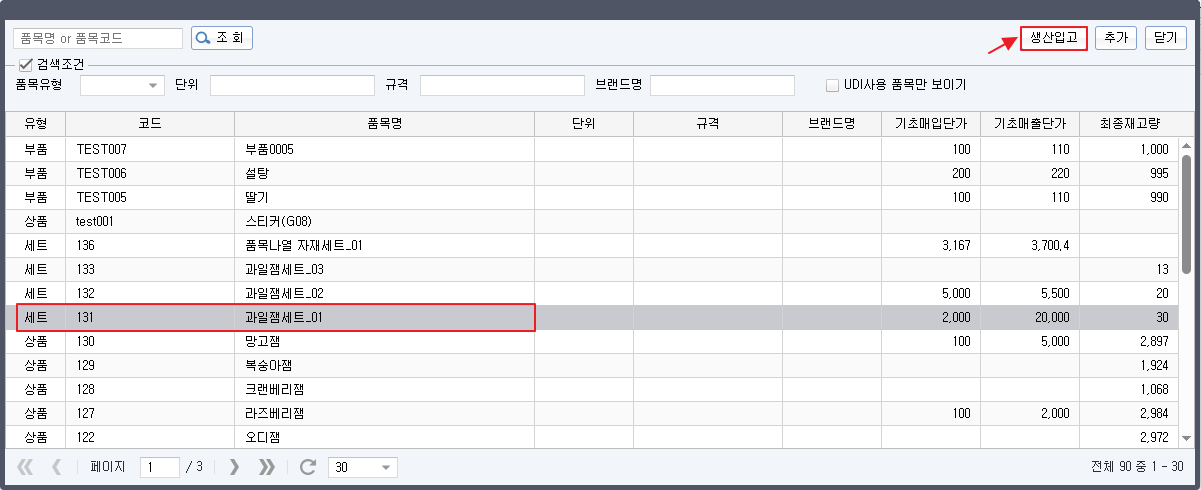 오른쪽 상단에 [생산입고]버튼이 보여집니다.