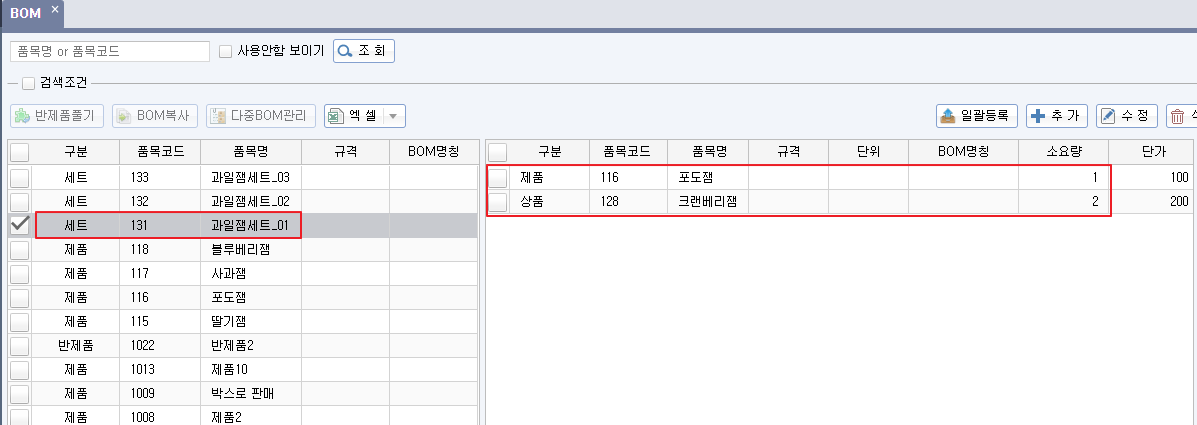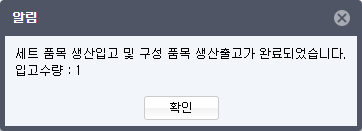 [세트 생산입고]창에는 BOM에 등록되어있는 정보가 불러와지며,
