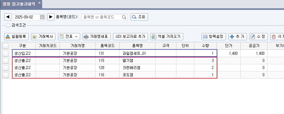 ④ 생산출고/생산입고된 내역은 [물류/재고] - [일일/기간 입고출고내역]에서 확인 가능합니다.