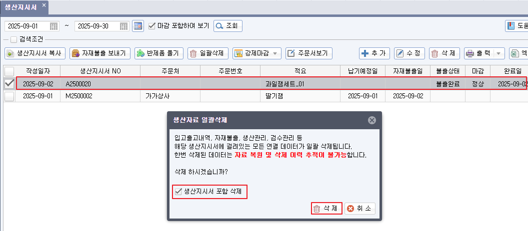 (생산지시서도 삭제하고자 하시려면 [생산지시서 포함 삭제]에 체크 후 삭제하시면 됩니다.)