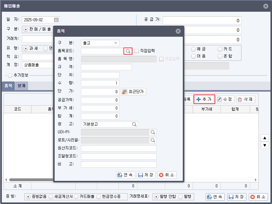 ③ [매입매출거래입력] 및 [일일/기간 입고출고내역] 등 품목을 검색하여 선택할 수 있는 메뉴에서 해당 세트품목을 선택하면