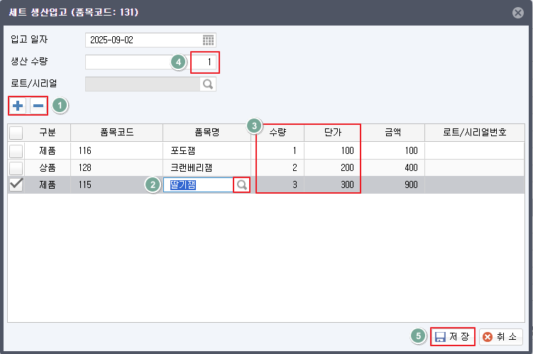 구성품목의 수량/단가 확인 및 생산수량을 입력 하여 [저장]하면 생산출고/생산입고가 완료됩니다.