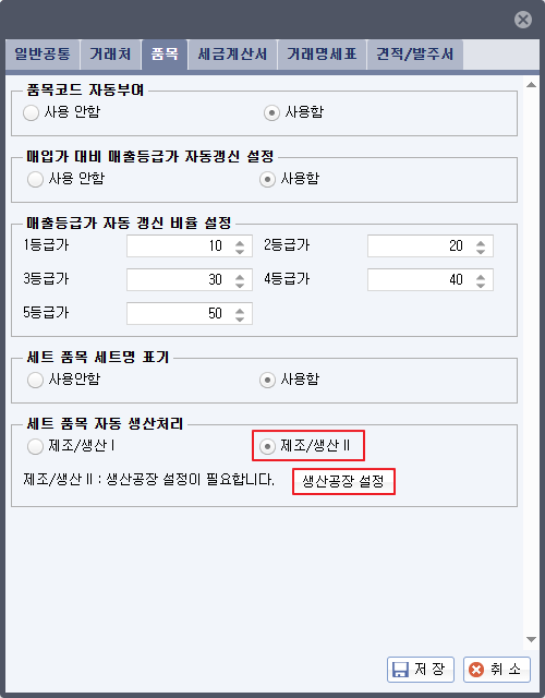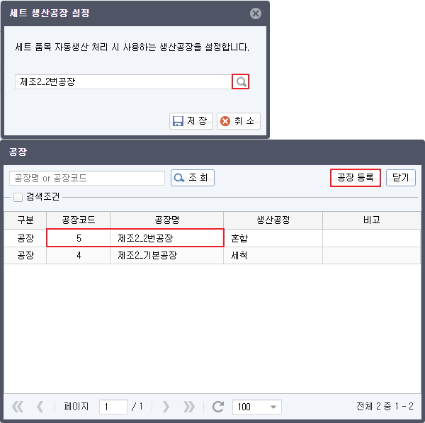 [세트 품목 자동 생산처리] - [제조생산Ⅱ]로 설정할 경우 [생산공장 설정]을 해야합니다.