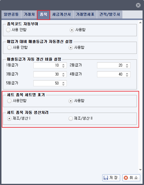 [세트 품목 세트명 표기]의 기본설정은 사용안함이며, 사용함으로 설정 시 [세트 품목 자동 생산처리] 설정이 가능합니다.