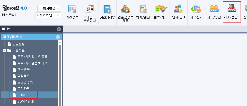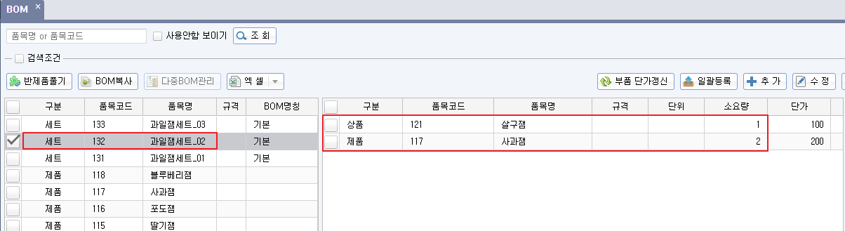 ② [기초정보] - [품목] - [세트품목(제조/생산Ⅱ)]에 등록된 품목은 [제조/생산Ⅱ] - [BOM]에 등록됩니다.