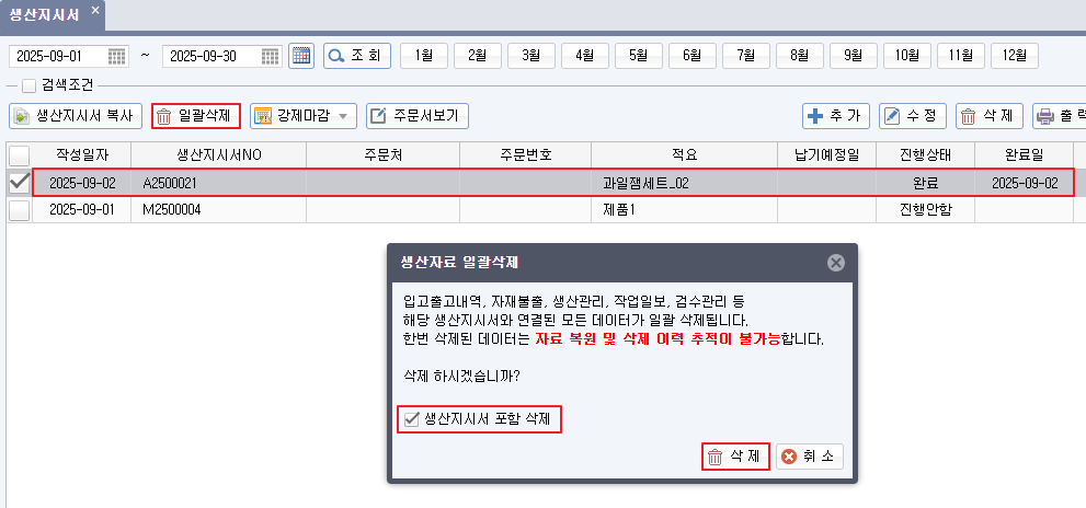 (생산지시서도 삭제하고자 하시려면 [생산지시서 포함 삭제]에 체크 후 삭제하시면 됩니다.)