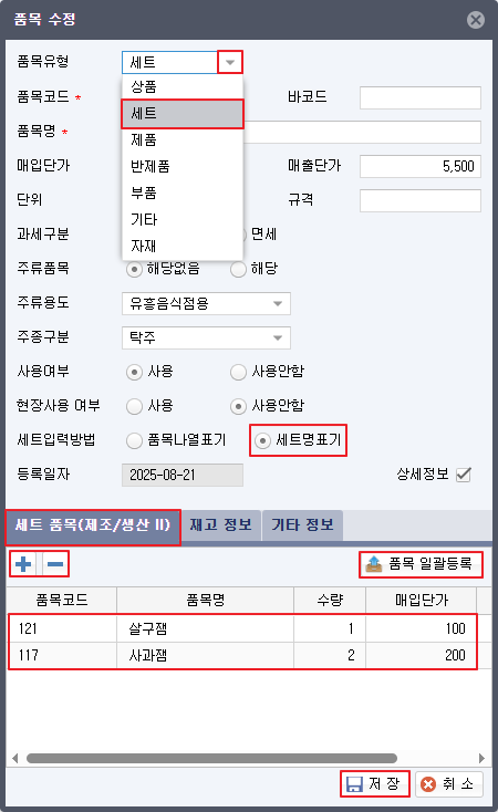 [세트품목(제조/생산Ⅱ)]의 구성품목을 [+/-] 버튼으로 추가수정하거나, 품목일괄등록으로 추가할 수 있습니다.